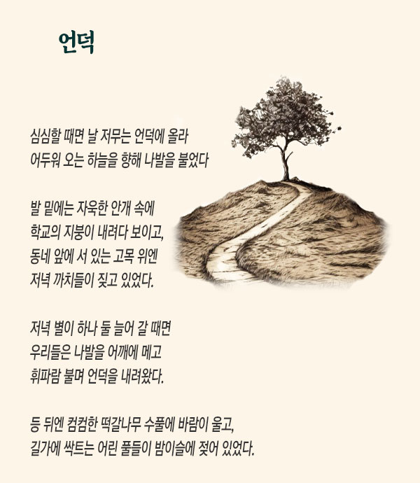 김광균(1914~1993) 시인의 ‘추일 서정’을 떠올린 것은 그래서다. 김광균의 시를 처음 만난 것은 중학교 1학년 국어 교과서에서 배운 ‘언덕’이었다. 심심한 저녁 언덕에 올라 나발을 불며 미래에 대한 꿈과 희망을 상징하는 어린 시절의 모습을 회상하는 내용의 이 시는 김광균 시 특유의 회화적 요소가 짙은 작품이었다. ‘나팔’ 대신 ‘나발’이란 시어를 쓴 게 언짢았지만, 열네 살 중1한테는 시에 드러난 소년의 모습이 매우 강렬한 공감으로 다가왔었다.