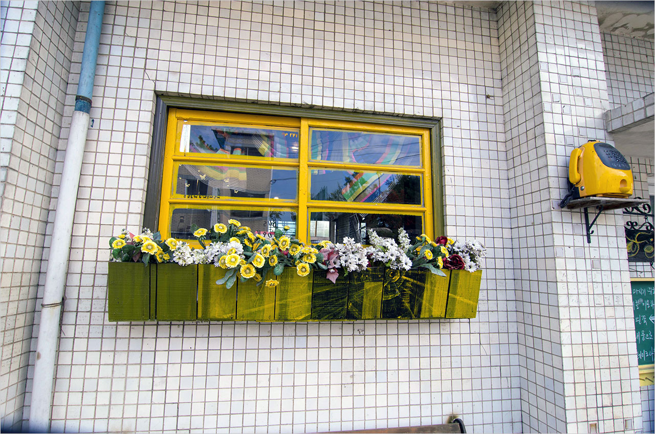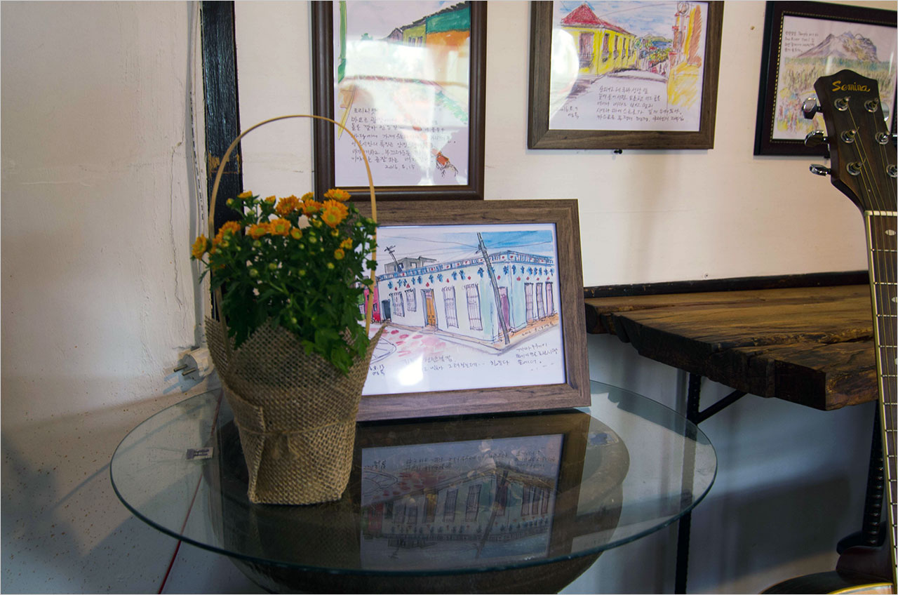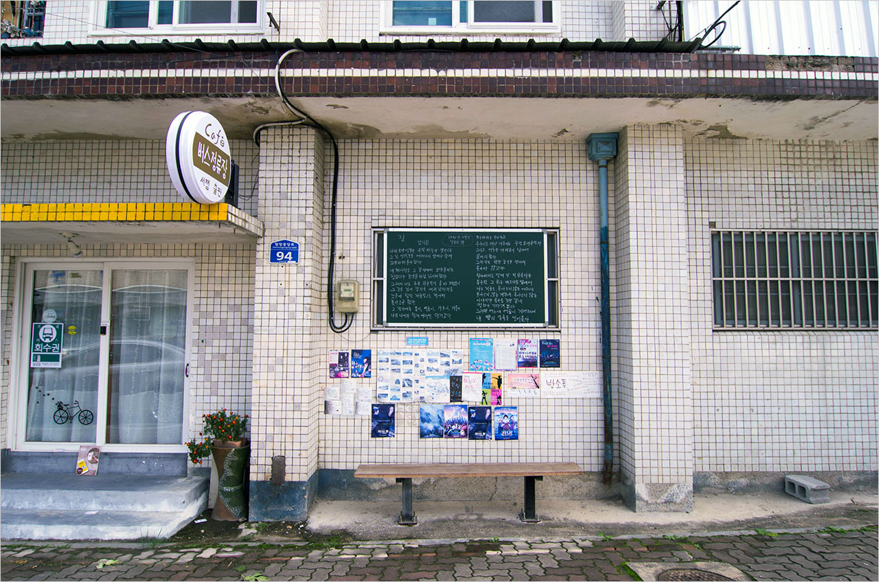 전시회는 상주군 함창읍의 카페 ‘버스 정류장’에서 열리고 있었다. 함창 버스터미널 맞은편에 있는 이 카페는 도로변의 30년도 넘었을 오래된 슬래브 이층집이었다. 하얀 타일을 붙인 낡은 건물의 외관은 버스 정류장 표지판과 건물에 바투 붙여놓은 나무 벤치와 공중전화기 따위와 묘하게 잘 어울렸다.