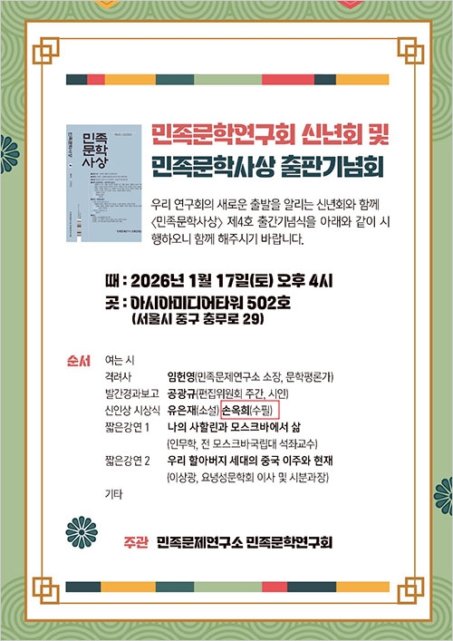 그가 느끼기에 검찰도 매우 협조적이었고, 재판부도 유족에게 여러 차례 발언 기회를 주고, 발언을 경청하면서 공감하는 듯했다고 했다. 나는 남은 건 이제 서훈을 신청하는 일이라고 했더니 그는 고개를 끄덕였다. 그가 포스터 하나를 모바일 메신저로 보내왔는데, 그건 민족문제연구소 민족문학연구회에서 펴내는 <민족문학사상> 출판기념회 소식이었다.