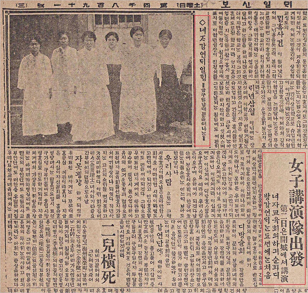 강연의 주제는 ‘조혼과 축첩 폐혜’, ‘가정 개조’, ‘여성 교육’, ‘육아 교육’ 등이었는데, 강연의 내용이 여성들의 한과 분노를 일깨울 때, 여성들은 눈물을 흘리며 은비녀, 금가락지를 뽑아서 성금을 내놓는 등 그것은 조선 여성 해방운동이라 해도 지나치지 않았다.