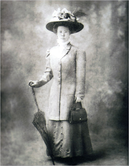 사진 속 여인은 동양인의 외모만 아니라면, 화려한 차림새가 19세기나 20세기 초반의 서구 영화에 나올 법한 모습이다. 구두에 코트를 입고, 보닛(bonnet)이라 불리는 챙 넓은 모자를 썼으며, 핸드백과 양산을 들고 선 여인은 차분하게 정면을 응시하고 있다.