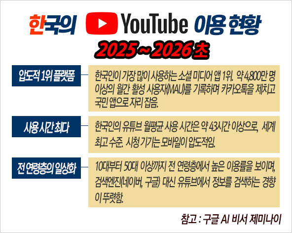어린이부터 고령의 노인들에 이르기까지 유튜브의 구독자들은 저마다의 취향과 기호에 따라 이리저리 쓸려다니며 잘 차려진 진수성찬 같은 콘텐츠를 소비한다. 마침내 “글로벌 문화의 중심(Epicenter of Culture)이자, 방송 및 OTT를 능가하는 가장 강력한 미디어 플랫폼”(구글 제미나이)으로 진화했다. 이쯤 되면 유튜브는 단순한 영상 공유 플랫폼을 넘어 이 난만한 21세기를 압축 상징하는 압도적 미디어가 된 것이다.