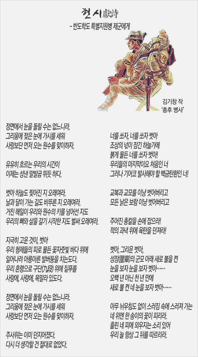 <매일신보>에 발표한 ‘헌시(獻詩)’(1943. 11. 16.)는 ‘반도학도 특별지원병 제군에게’라는 부제를 달고 있다. 학도지원병 제도는 일제가 1943년 8월부터 실시한 징병제와 함께 식민지 청년들에게 황국신민의 의무로 강요된 전쟁동원령이었다. 이 시는 일제의 침략전쟁과 학도지원병의 영웅적 전투 행위를 그려내면서 조선 학생들에게 학도지원병 출정을 독려하고 있다.