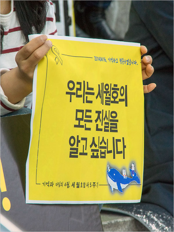 2014년에 세월호 촛불 때의 공기도 무심하기는 마찬가지였다. 서명 등으로 참여하는 이들도 적지 않았지만, 무심히 집회 참가자들을 일별하고 총총히 발걸음을 옮기는 이들도 많았다.