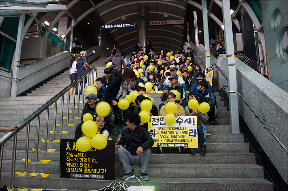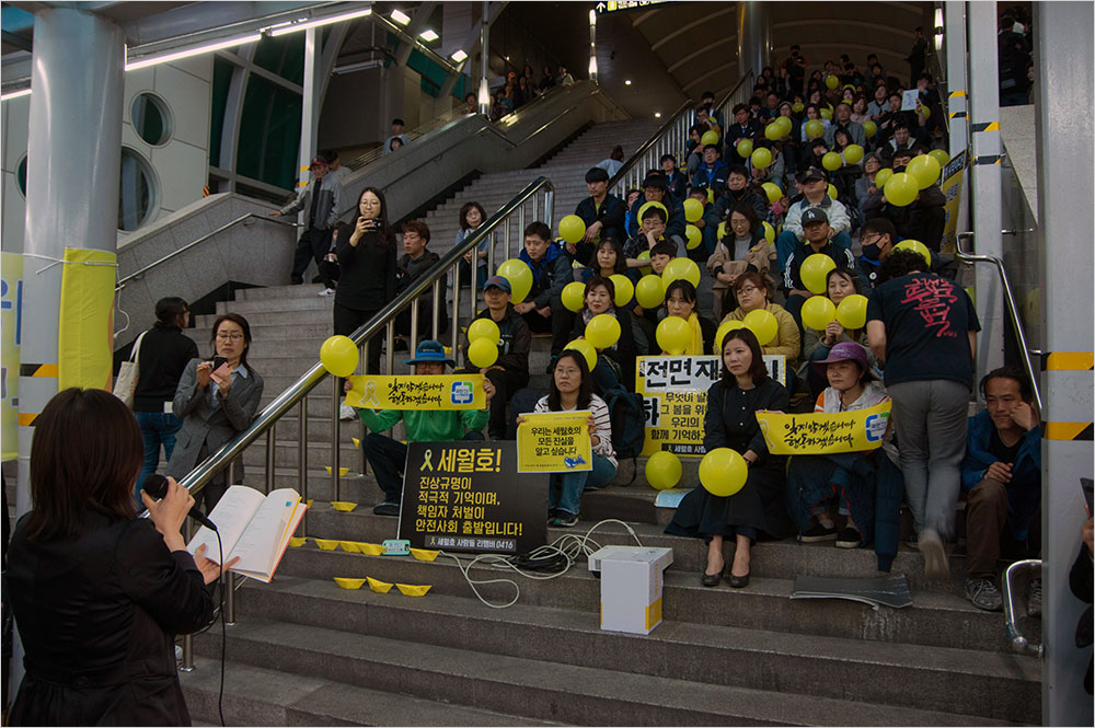 새로 역 앞마당에 관광안내소가 새로 생기는 바람에 마당에서 집회하기가 곤란해 참여 시민들은 역사로 오르는 계단 한쪽 면에 풍선을 들고 옹기종기 앉아서 집회를 치렀다. 집회는 의례적으로 1시간 반쯤 진행되면서 ‘특별수사단 설치’와 사고의 ‘전면 재조사’를 촉구하면서 끝났다.