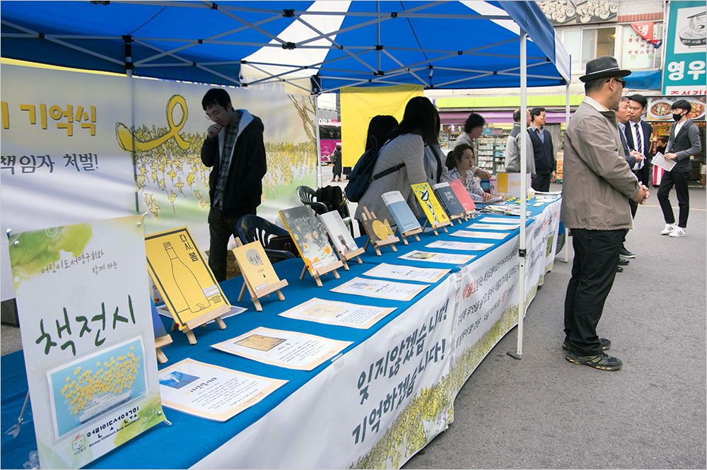 16일 구미역 앞에서 정오부터 시작된 서명운동과 책 전시 등 시민 캠페인에 이어 오후 6시부터는 세월호 5주기 구미 시민추모제가 열렸다. 2014년에 여러 차례 밝혔던 촛불문화제가 어제 일처럼 떠올랐다. 시민들은 걸음을 멈추고 서명에 참여하거나 전단을 받아들고 흘낏 서명대를 돌아보며 걸음을 재촉하고 있었다.