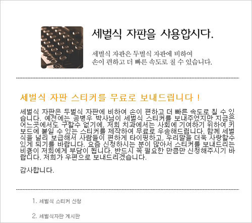 나는 한글문화원 소식을 통해서 세벌식을 알게 되었는데, 한글의 구성원리에 따른 글자판을 쓰는 게 국어교사로서 마땅한 일이라 여겼다. 공병우 박사가 타계하기 전이라 한글문화원에 요청하여 딱지(스티커)를 받았다. 그 손톱 반만 한 딱지를 각 글쇠에 붙여 놓고 끙끙대길 한 달여, 신통하게도 내 열 손가락은 시나브로 두벌식의 기억들을 지워내며 세벌식에 익숙해져 갔다.