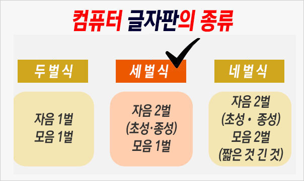 세벌식 글자판은 한글의 구성원리와 같다. 자음 두 벌(초성과 받침), 모음 한 벌의 세벌식 글자판은 지금은 타계한 한글 기계화의 선구자, 공병우 박사가 60여 년 전 타자기를 만들 때, 두벌식으로는 기계 공학적으로 여러 가지 문제가 있다는 것을 알고 만들기 시작한 자판이다.