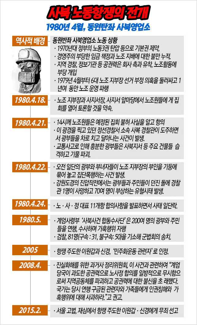 1980년 오늘(4월 21일) 오후 2시께, 국내 최대의 민영 탄광인 강원도 정선군 사북읍의 동원탄좌 사북광업소에서 탄광 노동자들의 시위가 일어났다. 70년대 정부의 노동삼권 탄압 등으로 인한 기본권 제약에다 저임금과 어용노조에 대한 누적된 불만이 마침내 폭발한 것이었다.