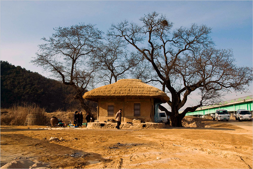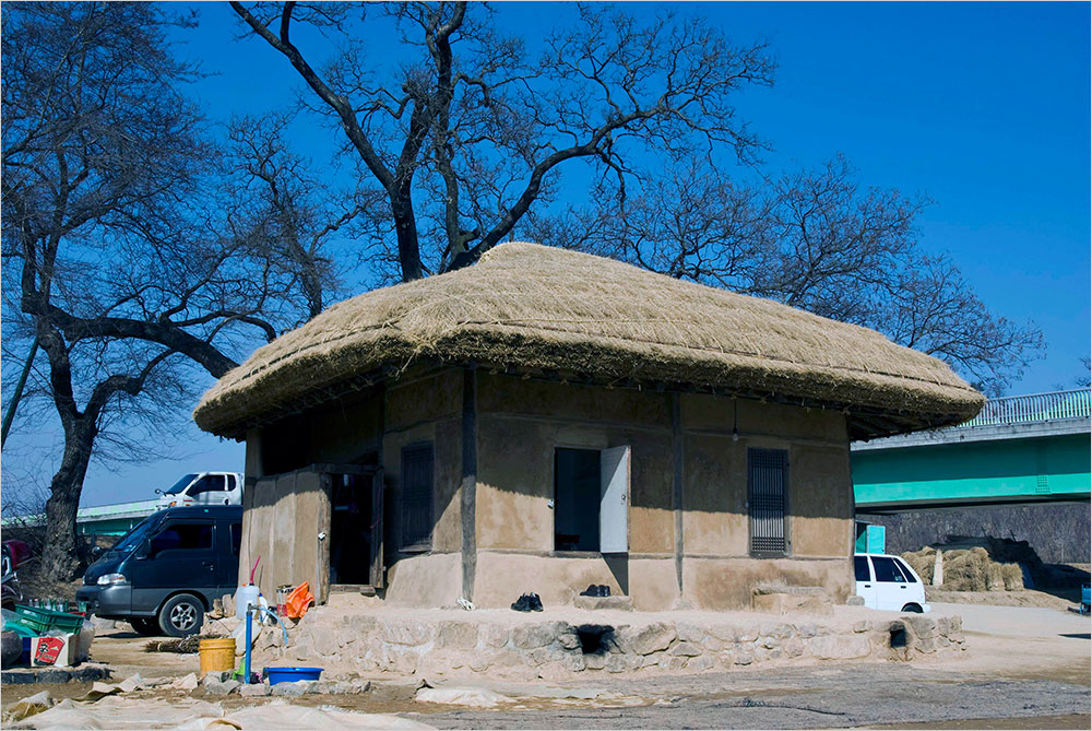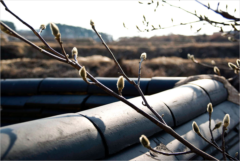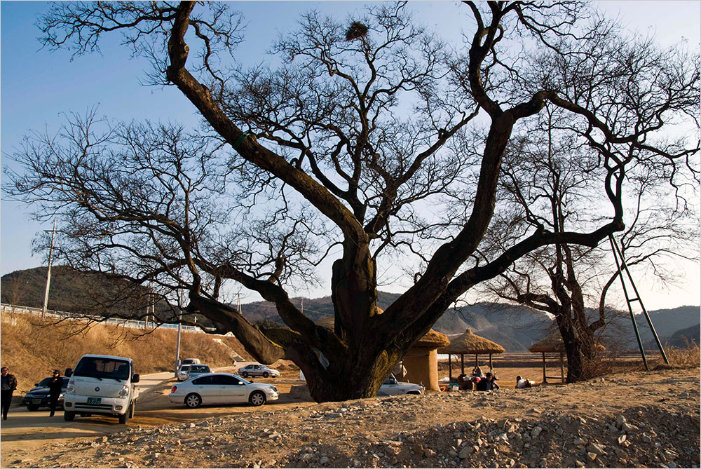 하늘은 쨍하고 금이 갈 만큼 맑고 시린 푸른빛이다. 푸근한 초가지붕의 양감 위에 유연하게 뻗은 회화나무의 마른 가지가 그 하늘을 정교하게 가르고 있다. 하늘 까마득히 뻗은 가지 끝에 까치집이 하나 달렸다.