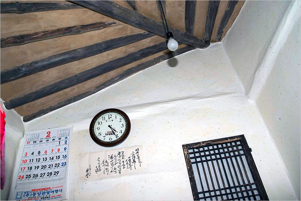 반자 없이 서까래를 드러낸 낮은 천장 아래 방은 좁다. 네모난 낮은 상을 마주하고 서너 사람이 앉으면 방이 꽉 찬다. 앞문 맞은편은 다락문이다. 옆에는 어울리지 않는 엔틱 형의 벽시계가, 그 아래엔 어느 주객이 남긴 낙서가 마치 편액처럼 걸렸다. 서까래에 걸린 백열등이 이 집의 역사만큼이나 허전하고 쓸쓸하다.