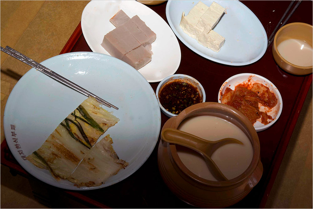 주모가 직접 담근 진한 농주와 손수 만든 묵과 두부, 배추전 등이 나그네를 반긴다. 농주와 묵, 두부, 배추전으로 짠 상차림이 1만2천 원이다.