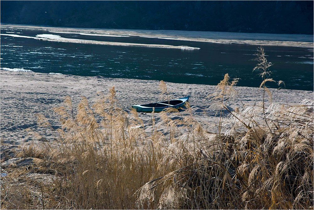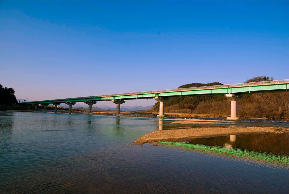 회화나무 너머 제방에 오르니 비낀 햇살 아래 강물이 반짝였다. 갈수기라 수량이 준 강물 이편으로 갈대밭에 작은 배 하나가 버려져 있다. 강을 가로질러 예천군 풍양면과 문경시 영순면을 잇는 삼강교가 크고 날렵한 몸뚱이를 뉘고 있었다.