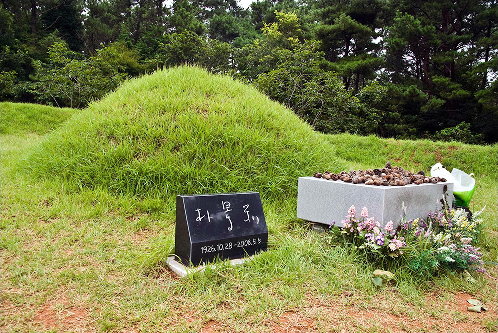 추모공원으로 꾸미면서 세운 것이리라. 봉분 앞 중앙에는 좀 두꺼운 몸피의 화강암 상석이 놓였고, 그 왼편으로는 검은 대리석에 선생의 이름을 새긴 표지석이 섰다. 한자로 쓴 이름은 선생의 자필 같아 보인다. 이름 아래 기록된 생몰연대(1926.10.28.~2008.5.5.)가 한 작가의 삶을 무심히 알려주고 있다.
