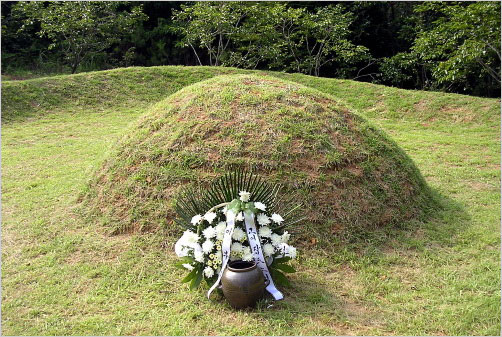 묘소 상석 앞에 핀 야생화는 생화가 아니라 조화다. 한 친구가 그게 훨씬 낫다고 말한다. 생화가 말라 추하게 무덤 주변을 어지럽히는 것보다 조화가 낫다는 거다. 하기야 꽃에 따라 그 추모의 무게가 달라지지는 않을 터이다. 좌판 위에는 참배객들이 올려놓은 솔방울이 그득하다. 꽃이나 제물 대신 사람들은 인근의 소나무 열매를 바친 것이다.