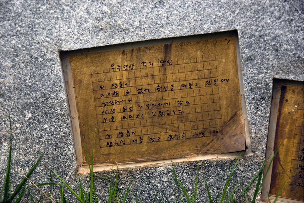 사흘 만에 날이 들더니 바다의 습기를 머금은 공기는 뜨겁고 역했다. 우리는 비스듬한 물매의 산기슭을 천천히 올라갔다. 묘소로 오르는 포장된 산길 주변은 고인과 관련된 시비와 친필원고를 새긴 돌 조형물 등이 홍접초와 베고니아 등의 꽃에 둘러싸여 있었다. 주변 잔디밭에는 배롱나무꽃이 화사했다.