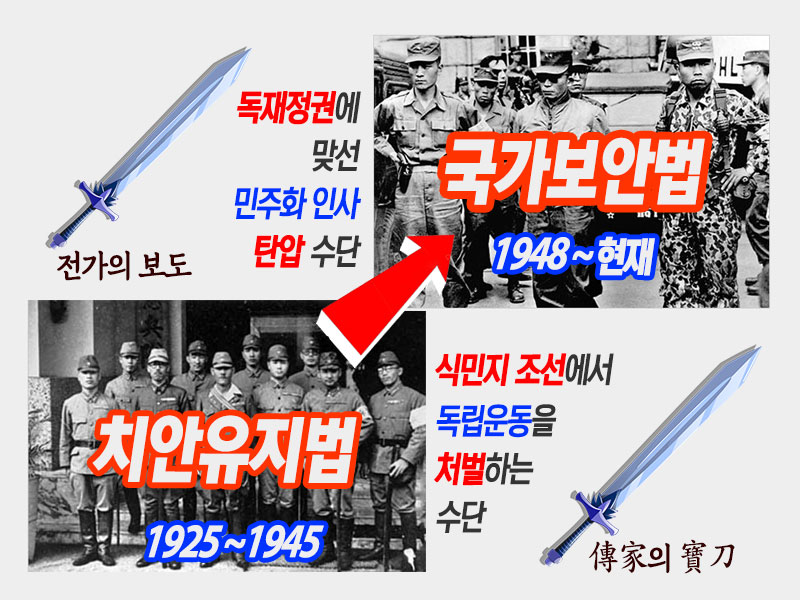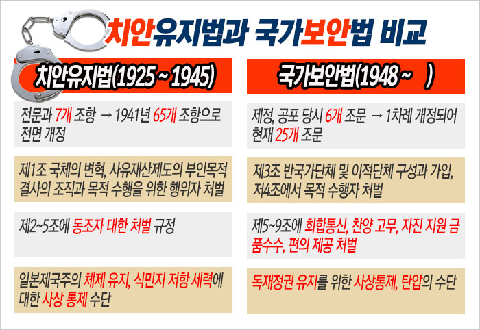 그러나 3년 뒤, 독립국 대한민국에서 이 악법은 뒤틀린 모습으로 되살아났다. ‘국가의 안전을 위태롭게 하는 반국가 활동을 규제’하는 국가보안법이 제정된 것이다. 치안유지법이 일본 제국주의 체제를 유지하기 위해 반체제 인사와 식민지 저항세력의 사상통제에 이용된 것과 마찬가지로 국가보안법은 독재정권에 맞선 민주화 인사들을 탄압하는데 전가의 보도가 되었다.