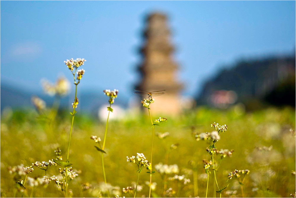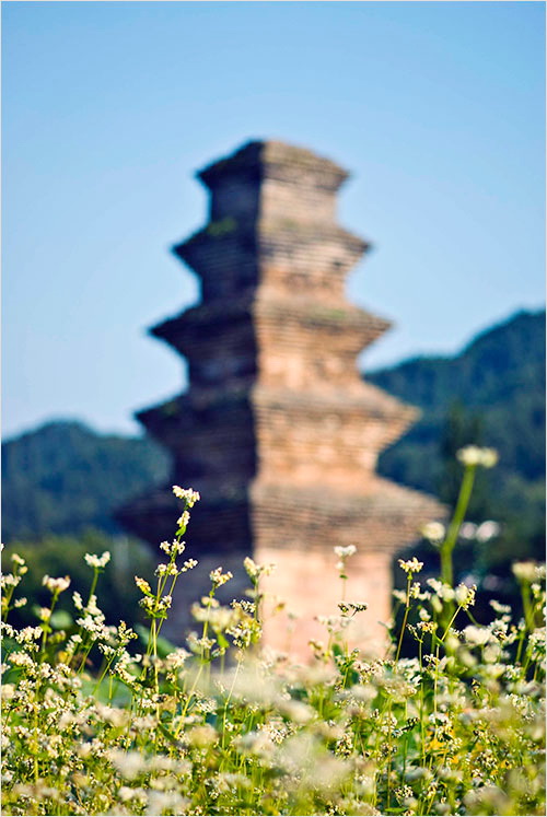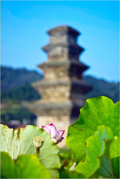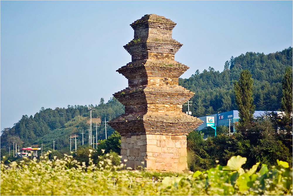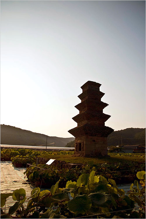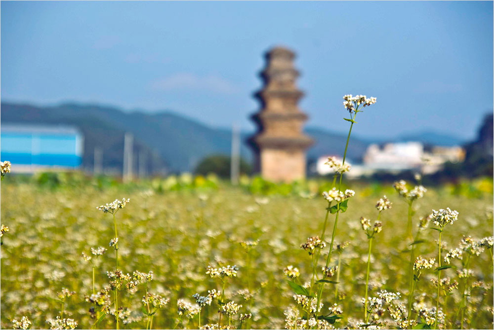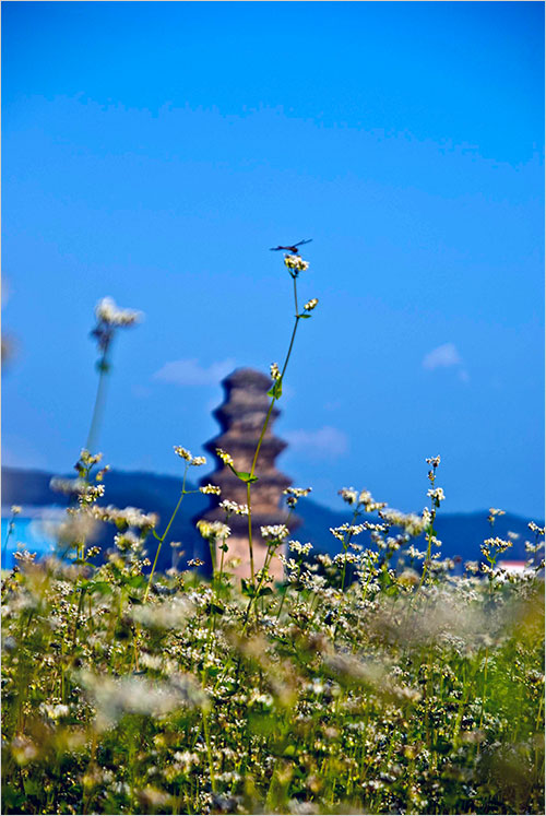 시들어가고 있는 메밀밭은 규모도 규모지만 제대로 자라지 않은 느낌이었다. 메밀꽃과 연꽃 너머로 희미하게 흐려놓은 탑의 실루엣이 아련하다. 그것은 마치 이 불탑이 처한 21세기의 풍경 같아 보였다. 그래도 따가운 햇볕은 익어가는 들판을 축복할 터였다.