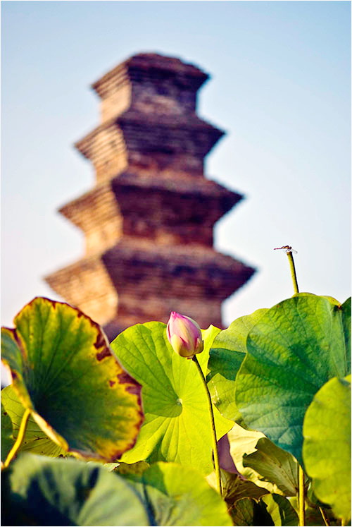 누구의 발상인지, 탑 주변에는 연꽃을 기르는 커다란 고무 함지를 빽빽하게 둘렀고 거기 핀 연꽃도 거의 끝물이었다. 글쎄, 연꽃이 만발하였을 무렵에는 이 연꽃의 행렬이 탑의 경관을 얼마나 도왔을까. 잠자리가 어지러이 날고 있는 탑 주변을 어슬렁거리며 사진을 찍었다.