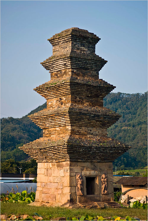 안동시 일직면 조탑리에 있는 보물 제57호 조탑리 5층 전탑도 마찬가지다. 조탑리(오죽하면 탑을 지은 마을이라 하였을까!) 탑은 통일신라 시대의 전탑(벽돌탑)으로 높이가 8.65m에 이르는, 작지 않은 탑이다. 그러나 빈 밭 가운데 쓸쓸히 서 있는 이 탑은 금방 눈에 띄지 않는다. 전탑 특유의 어두운 빛깔 때문이기도 하고 고층의 구조물에 익숙한 우리의 시선이 거기 오래 머물지 않기 때문이다.