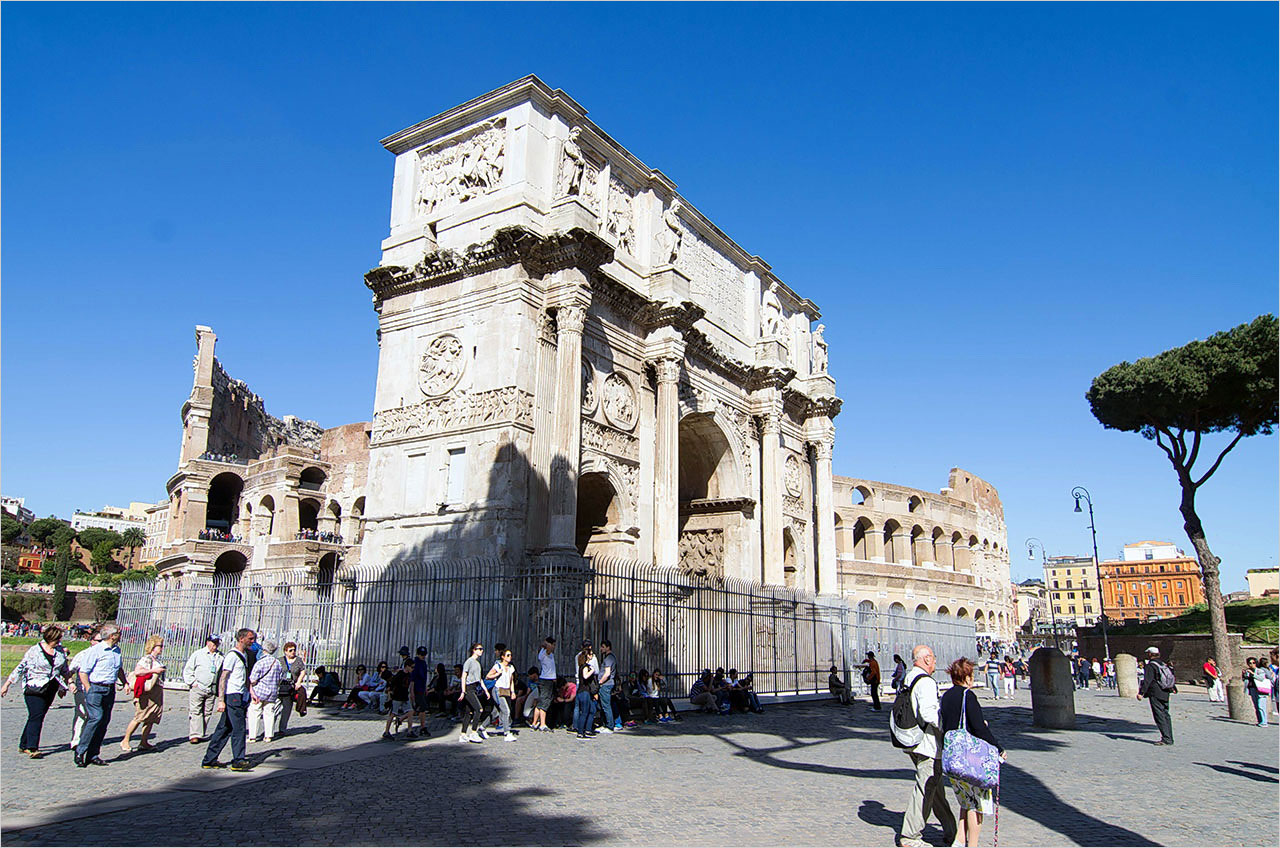 콜로세움 안으로 들어가는 대신 나는 맞은편 언덕에 오르거나 주위를 빙 돌면서 여러 장의 사진을 찍었다. 따가운 햇볕에 겉옷을 벗었는데도 땀이 배어났다. 콜로세움 앞쪽의, 312년 콘스탄티누스 1세의 서로마 통일을 기념해 세웠다는 콘스탄티누스 개선문 앞의 화단 턱에 앉아서 아내와 잠깐 이야기를 주고받았다.