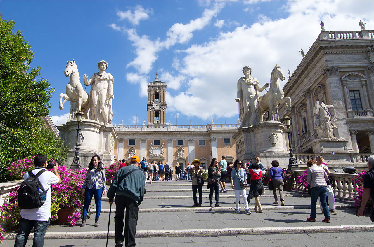 포로 로마노를 뒤로하고 로마의 최고 신인 유피테르 신전이 있어 고대 로마에서 가장 신성한 장소였던 카피톨리노(캄피돌리오의 형용사형) 언덕을 마저 오르자 해발 59m의 캄피돌리오(Campidoglio) 광장이 나타났다.