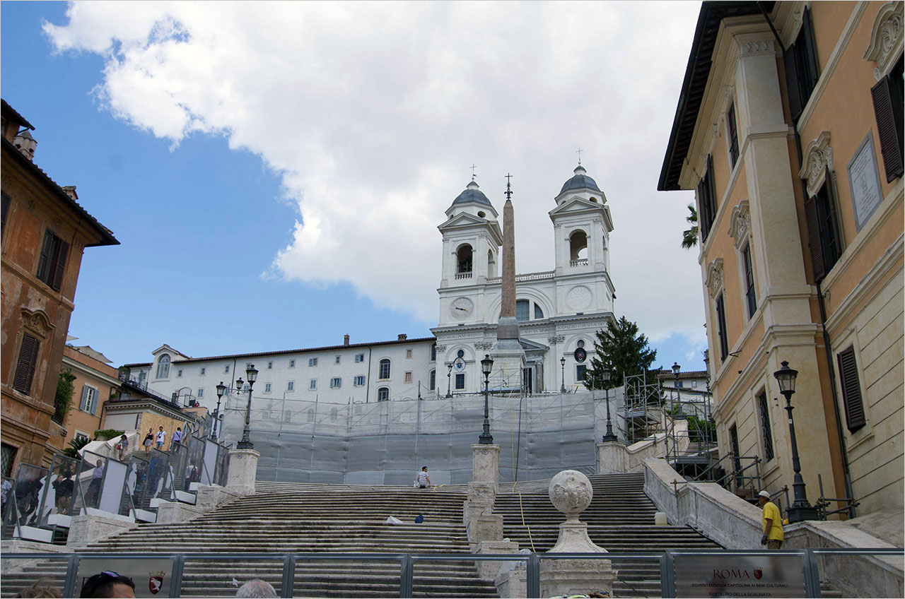 분수 주변은 트레비 분수 쪽보다 훨씬 많은 인파로 붐볐다. 오른쪽 언덕에 솟아 있는 트리니타 데이 몬티(Trinita dei Monti, 삼위일체) 성당이 공사 중이어서 계단으로의 출입을 통제하고 있어서였을까. 15세기 프랑스 수도회에서 세운 삼위일체 성당은 로마에서는 보기 드물게 종탑이 두 개다. 종탑 앞에는 성당에 어울리지 않게 오벨리스크 한 기(基)가 서 있었다.