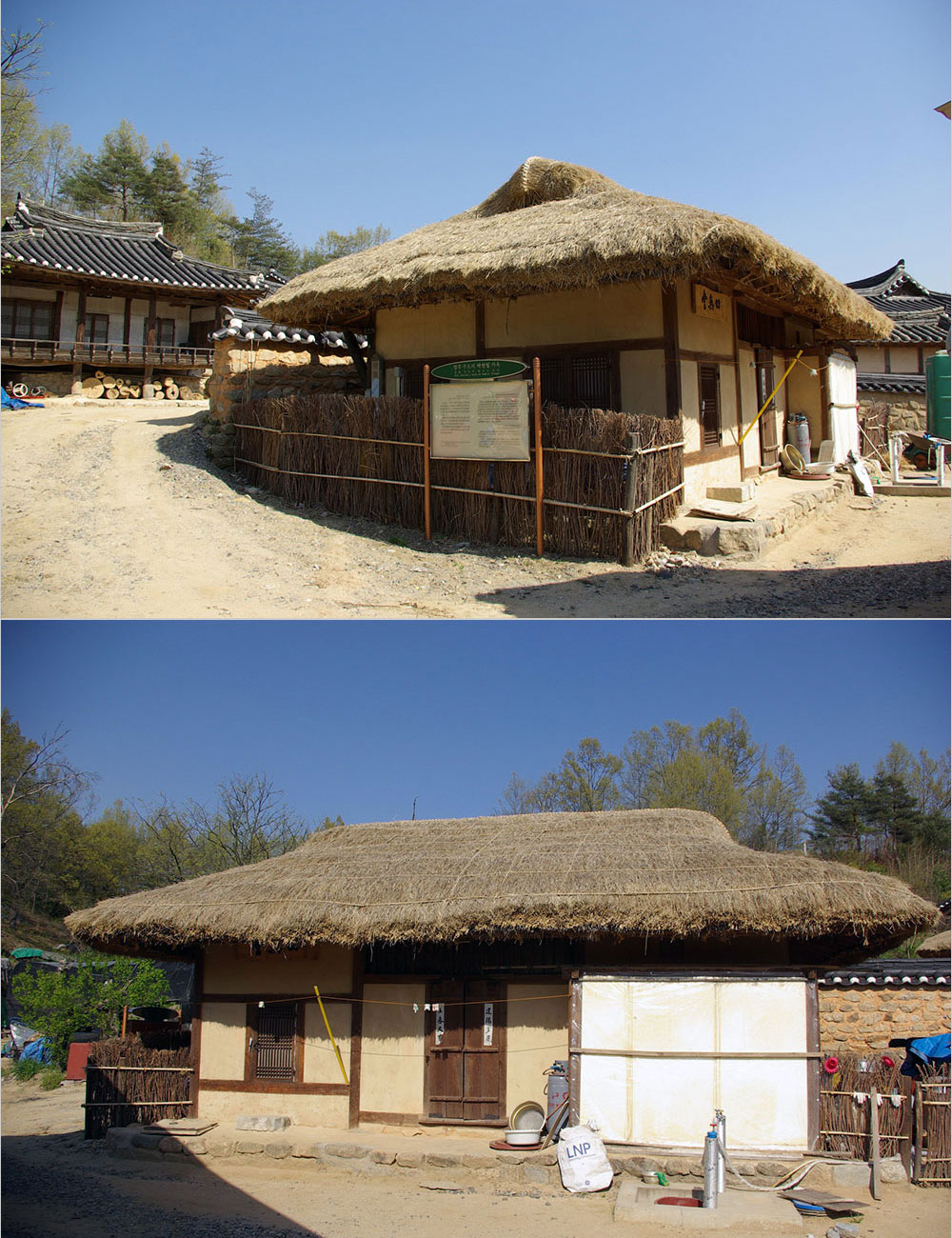 그림에서 보듯 마구간이 있어야 할 위치에 사랑방이 있는 것이 특이하다. 출입구 쪽의 사립 울타리와 부엌 앞에 세워둔 LPG 가스통이 이채로웠다. 마을 안에 미끈하게 치장한 서너 채의 양옥이 눈에 거슬리지 않을 만큼 마을은 예전의 퇴락한 모습을 말끔히 벗고 있었다.