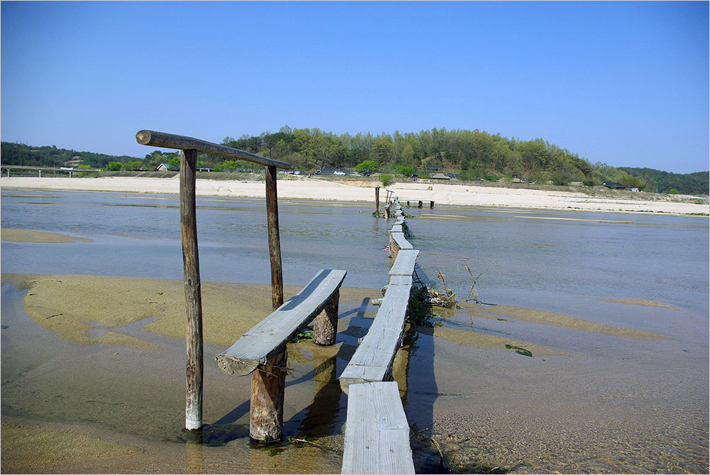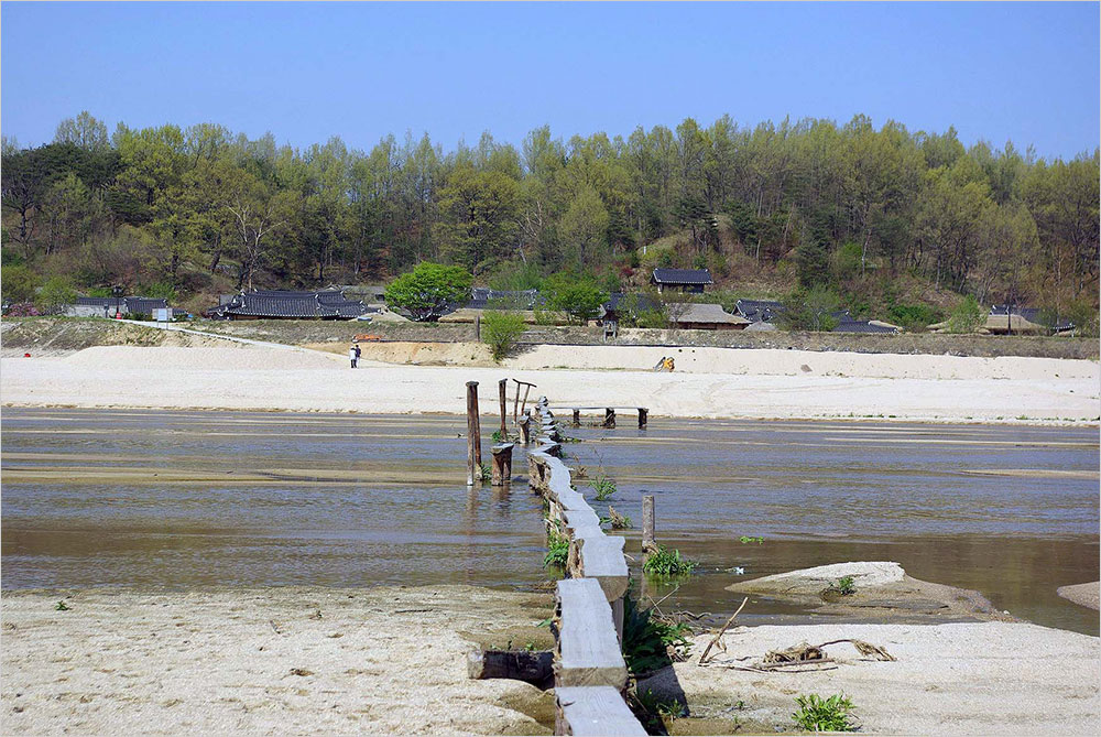 마을 중간쯤의 강둑 아래 백사장과 건너편 뭍을 이은 추억의 외나무다리를 재현하여 사람들을 초대한 것이다. 나무를 덧대 만든 이 옛날식 외나무다리는 폭 30㎝, 길이 150m. 한 사람이 겨우 지나갈 수 있을 만큼 좁다.