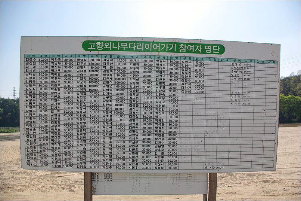 축제는 이태째 잘 치러졌던 듯했다. 이태 전과 같이 강둑 아래 게시판에는 ‘고향 외나무다리 이어가기 참여자 명단’이라는 제목 아래, 축제를 위해 기부한 사람의 명단과 그들이 낸, 많지 않은 기부액이 빼곡히 적혀 있었다.