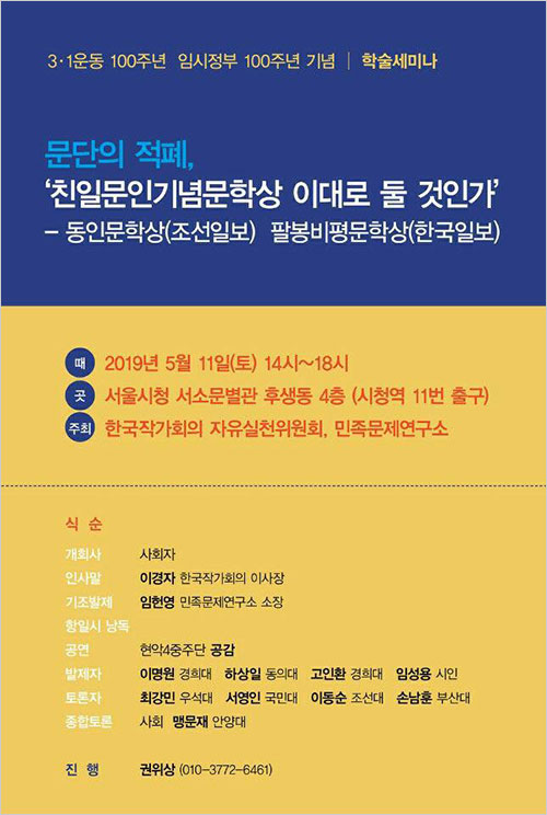 지난 11일 오후 서울시청 서소문별관에서 3.1운동·임시정부 100주년 기념 학술세미나 <문단의 적폐, '친일문인기념문학상 이대로 둘 것인가'>가 열렸다. 한국작가회의 자유실천위원회와 민족문제연구소가 주최한 이번 세미나에서 다룬 문학상은 동인문학상(조선일보)과 팔봉비평문학상(한국일보)이었다.