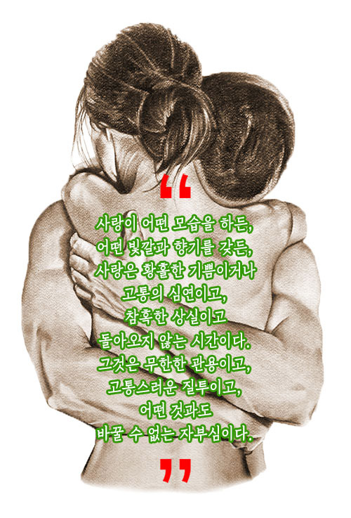 사랑이 어떤 모습을 하든, 어떤 빛깔과 향기를 갖든, 사랑은 황홀한 기쁨이거나 고통의 심연이고, 참혹한 상실이고 돌아오지 않는 시간이다. 그것은 무한한 관용이고, 고통스러운 질투이고, 어떤 것과도 바꿀 수 없는 자부심이다.