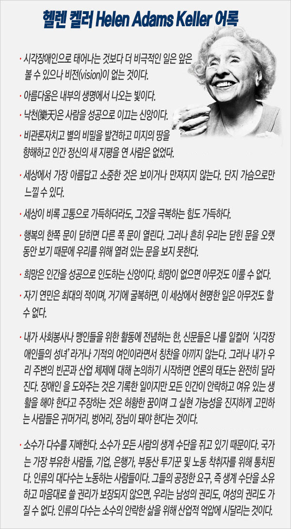 서가에서 그의 전기 <헬렌 켈러-고요한 밤의 빛의 된 여인>(미다스북, 2002)를 꺼내 뒤적이며 48년 전에 세상을 떠난 한 위대한 여성의 삶과 투쟁을 떠올려 본다. 그의 어록들은 그가 자기 삶의 한가운데서 깨우친 진실과 지혜의 향훈으로 지금도 그윽하게 빛나고 있다.