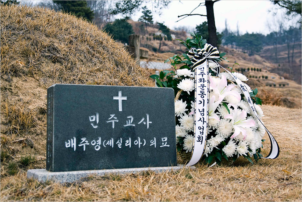 그이의 장례는 온 나라에서 달려온 교사들의 애도 속에 전교조장으로 거행되었다. 그날 궂은 눈비가 흩날렸던가. 배주영 세실리아는 안동 외곽의 천주교 묘지에 묻혔다. 그리고 해마다 기일이면 안동과 인근의 동료들이 그의 무덤을 찾았다.