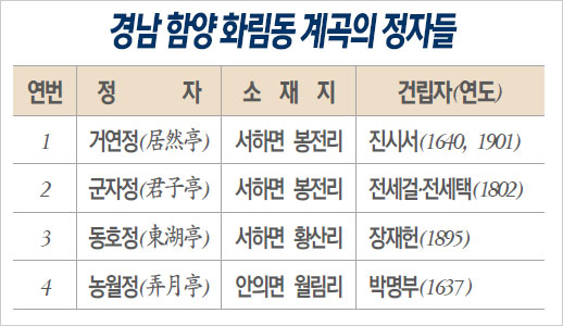 화림동의 정자들, 그곳은 조선조 선비들이 이 아름다운 계곡의 물과 숲, 꽃과 나무와 교유하는 공간이었다. 그러나 지금이 계곡에 남은 정자는 거연정·군자정·동호정 등 세 곳뿐이다.
