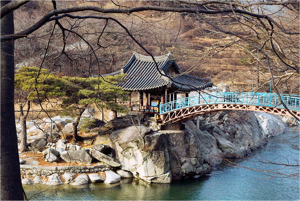 갈수기인데도 만만찮은 물줄기를 담고 있는 계곡을 넘어 거연정에 들려면 철제의 구름다리를 건너야 한다. 시내 이쪽에서 바라보는 정자의 풍경이 왠지 아련하다. 정자 아래를 휘도는 계류의 그윽한 비췻빛과 정자 앞에 휘어진 노송이 어우러져 연출하는 아름다움이다. 그러나 천박해 뵈는 푸른빛 칠을 한 철제 홍예교가 정자 일부를 가려 놓음으로써 그 소담스러운 운치를 깨어 버린다.