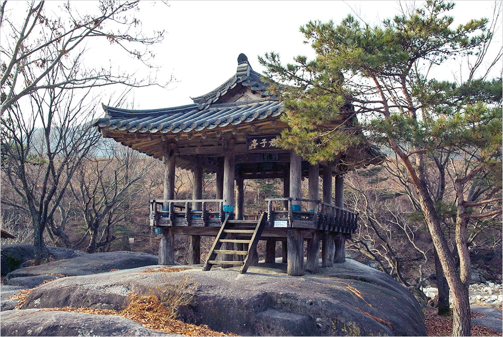 물가의 널따란 암반 위에 편안히 앉은 단청 없는 검박한 부재들에 서린 건 세월의 흔적이다. 인근 지곡면 개평리에 정침(正寢)을 두고 있던 대학자 정여창이 이곳을 자주 찾아 주변 풍광을 즐겼다 하여 ‘군자정’이란 이름을 얻었다. 누마루 위 기둥 아랫부분에 까닭 모를 푸른 칠을 해 놓은 이 정자는 같은 이름의 커다란 민박집 아래서도 호젓한 기품을 잃지 않고 있다.