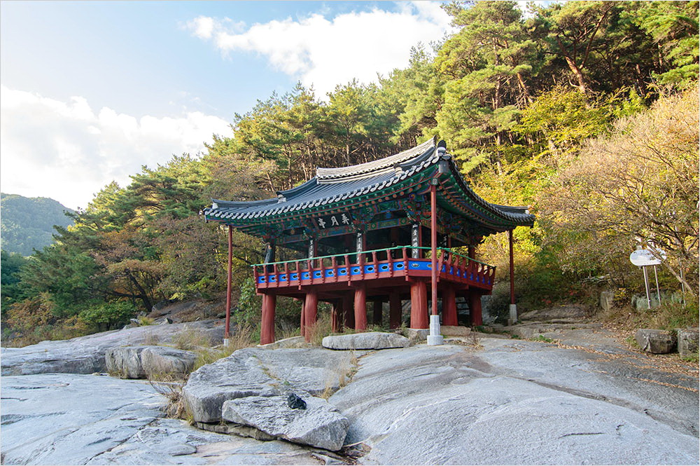 정자 앞 계곡에 길이 60m, 폭 40m 정도의 너럭바위, 차일암(遮日岩)이 섬처럼 솟아 있다. 매끈하고 하얀 바위의 살결이 여인의 속살처럼 빛난다. 그것은 마치 물 가까이서 맘껏 풍류를 즐기라고 자연이 사람들에게 베푸는 은혜 같아 보인다.