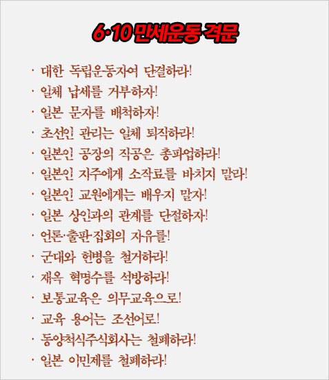 1926년 6월 10일은 조선의 마지막 임금인 순종(1874~1926)의 인산(因山, 임금의 장례)일이었다. 헤이그 밀사 사건(1907) 이래 일제와 친일파의 압력으로 퇴위하게 된 고종을 이어 대한제국 제2대 황제가 된 순종은 명목상 재위 18년 만인 1926년 4월 25일 심장마비로 승하했고, 이날 인산이 거행된 것이었다.