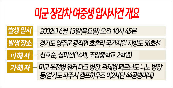 2002년 6월 13일 10시 45분, 경기도 양주시 광적면 효촌리 소재 지방도 제56호선에서 주한 미군 보병 2사단 대대 전투력 훈련을 위해 이동 중이던 부교 운반용 장갑차에 깔려 여자 중학생 두 명이 현장에서 숨졌다.