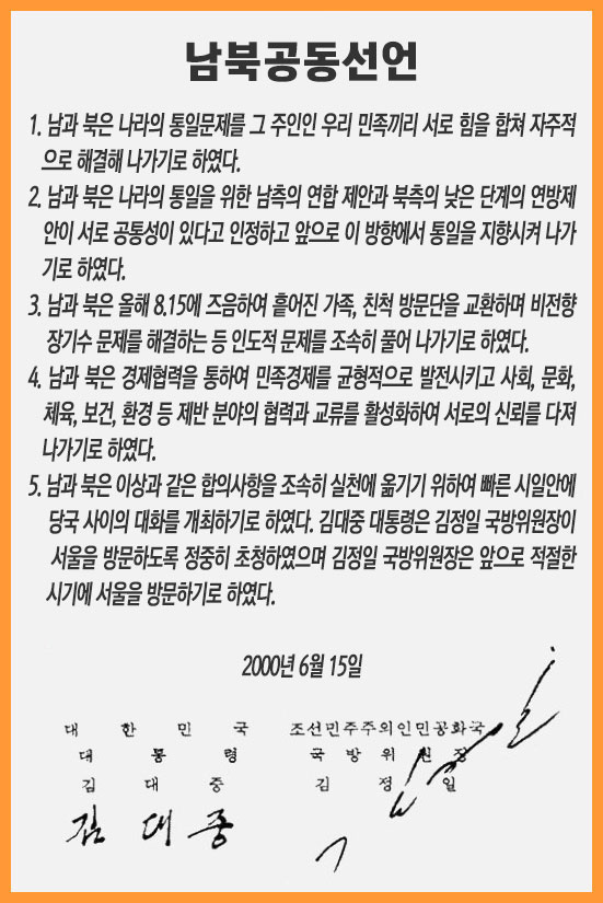 2000년 오늘(6월 15일), 북한의 수도 평양에서 대한민국 대통령 김대중과 조선민주주의인민공화국 국방위원장 김정일이 남북 공동선언을 발표하였다. 그것은 남북 정상이 역사상 처음으로 만나 이틀간(6.13~15.)의 회담 끝에 이루어낸 값진 결실이었다.