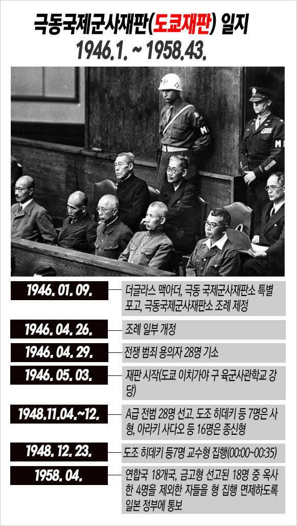 도쿄재판은 1946년 1월 점령군사령관 더글라스 맥아더의 극동국제군사재판소 특별 포고와 극동국제군사재판소 조례 제정으로 준비되기 시작했다. 전범 28명이 기소된 것은 같은 해 4월이었고, 5월 3일부터 재판이 시작되었다.