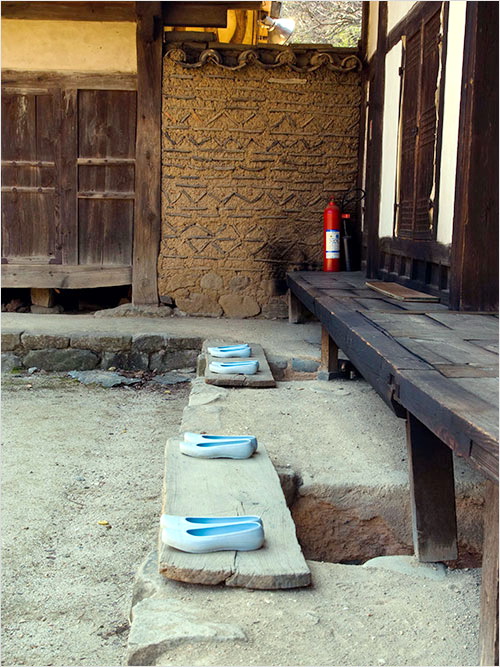 대청 왼쪽의 방 앞에 하얀 고무신이 놓였다. 보통 방 앞에 놓인 신발은 그 집에 사는 사람들의 삶에 대한 증명이지만 관광객들의 숙박을 받는 송소고택에선 그게 손님에게 제공하는 서비스일 수 있겠다. 대개의 고택에서 제공하는 숙박이 그렇듯 이 집엔 장작불 난방과 보일러 난방이 섞여 있다고 .(☞ 누리집 바로가기)은 전하고 있다.