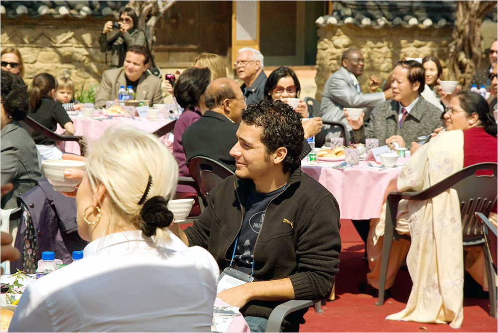 헛담 쪽으로 기다랗게 차린 조리대에 갖가지 음식이 풍성하다. 막걸리와 식혜, 불고기와 각종의 부침개 앞에 봉사할 준비가 끝난 아낙들이 일렬로 조신하게 서 있었다. 사회자의 설명에 귀를 기울이거나 음식을 둘러보는 외국인들의 표정이 흥미로웠다.