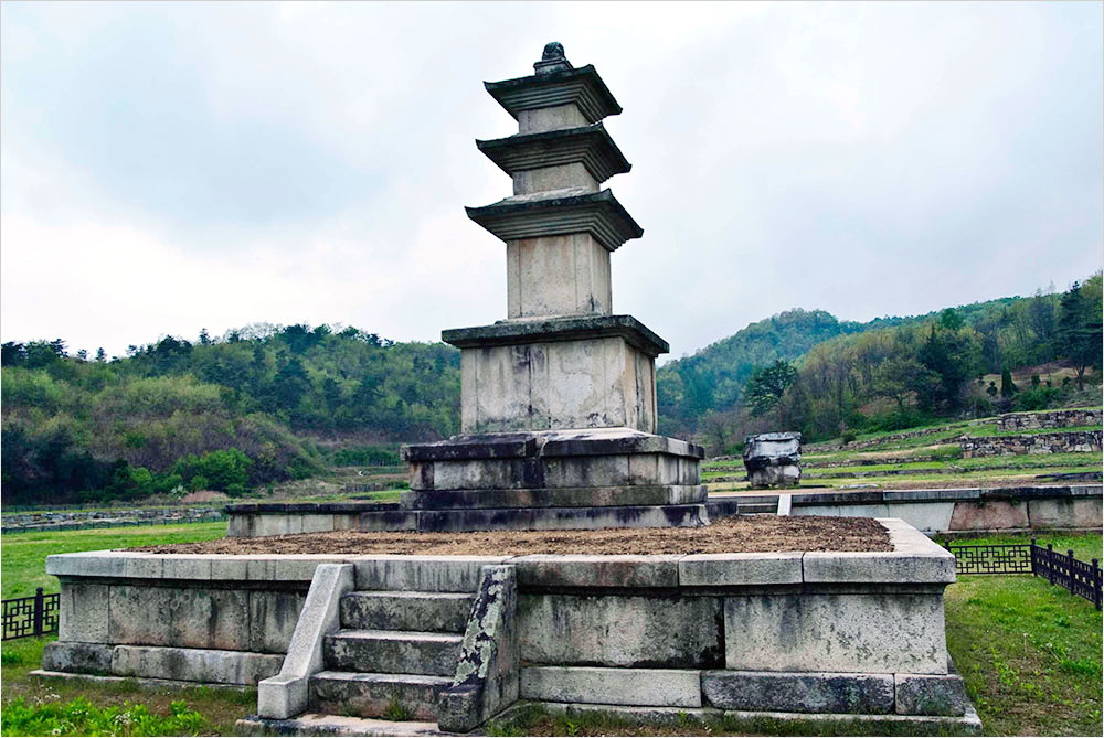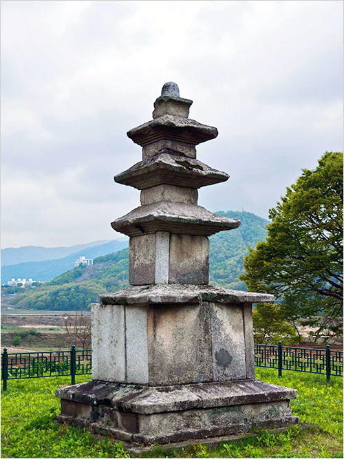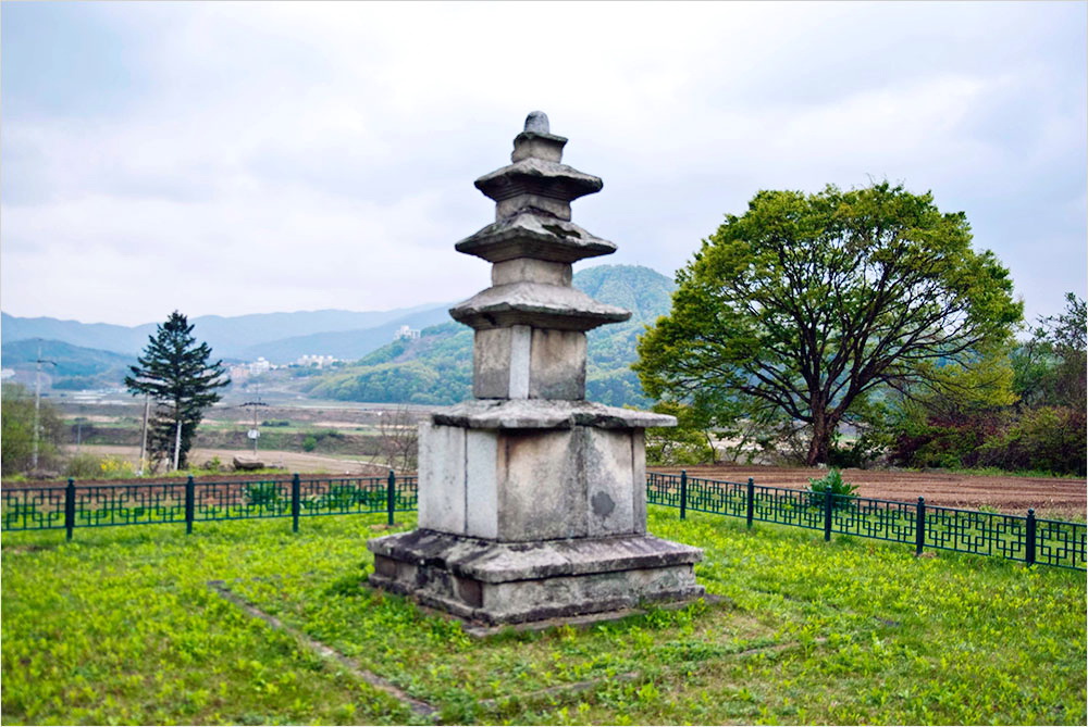 차를 공터에 대면서 조금 실망하지 않을 수 없다. 철책으로 둘러싸인 탑과 탑비의 귀부와 이수는 잡초 속에서 간신히 그 존재감을 드러내고 있었다. 막 써레질을 끝낸 밭 저편을 배경으로 선 삼층석탑은 한낮의 적요 속에 초라하기만 했기 때문이다.