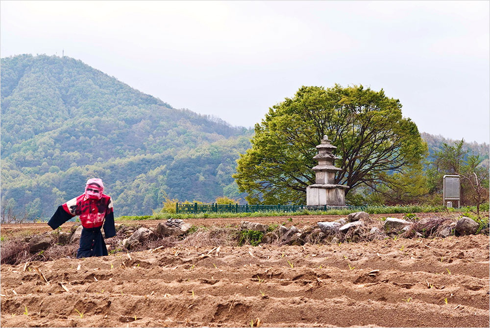 탑 주변 밭 가장자리에 붉고 검은 옷가지를 뒤집어쓴 허수아비 하나가 탑을 등지고 서 있었다. 철책 안에 드문드문 돋아난 잡초 가운데 공작새처럼 화려하게 가지를 뻗은 고목을 배경으로 안존하게 서 있는 탑은 어쩐지 쓸쓸하고 처량해 보인다. 한때는 내세에 대한 사부대중의 ‘서원(誓願)’이 이루어졌던 돌탑은 이제 ‘그만한 내력의 무심한 돌 구조물’에 지나지 않게 된 것이다.