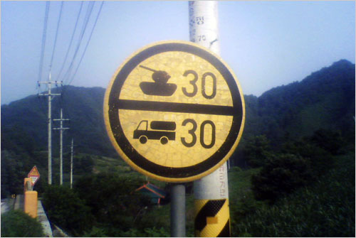 해가 중천에 걸렸다. 오던 길을 되짚어 오는데, 유난히 낯선 도로 표지판이 눈에 들어온다. 이 표지판은 주도로가 아닌 마을 길, 특히 작은 다리 앞에 주로 세워져 있었던 것 같다. 표지판에는 군사도시 원주에 걸맞게 탱크가 박혀 있었다.