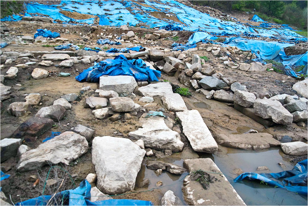 길가 느티나무 아래 차를 대고 지광국사현묘탑비로 가는 나지막한 산 중턱을 오르는데 산 아래부터 골짜기에 이르기까지 발굴조사의 흔적이 역력하다. 2001년부터 실시한 4차례의 발굴조사 결과 통일신라 시대부터 조선시대에 이르는 다양한 시기의 건물터 19동과 우물터 3개소, 석축 및 담장 유구, 계단 터를 비롯하여 금동불입상, 연화 대석, 각종 기와류와 자기류 등의 유물이 확인되었다는 흔적인 셈이다.