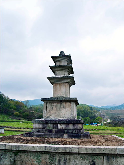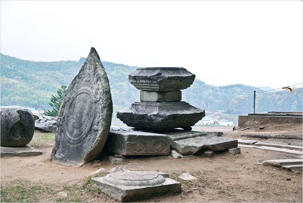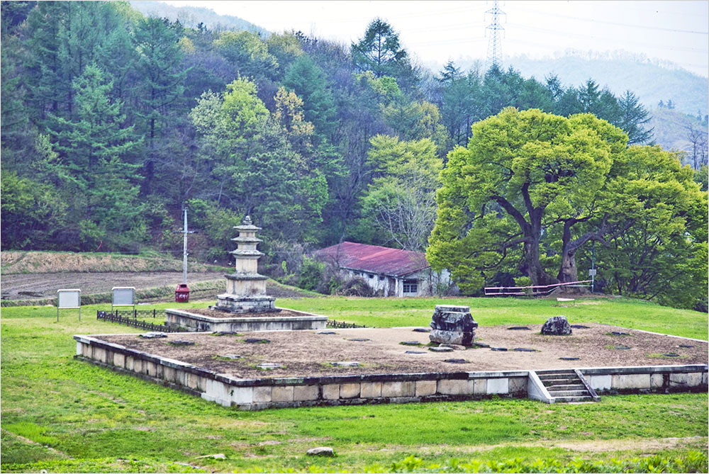 뒤편 산기슭에 재현해 놓은 원공국사승묘탑 앞에 서면 눈 아래로 절터가 한눈에 들어온다. 금당 주변에 점점이 박힌 주춧돌과 불좌대, 석재들과 그 가운데서 무연히 솟아 있는 삼층석탑이 어우러져 연출하는 풍경은 쓸쓸하고 황량하다. 폐사지의 풍경이란 으레 그럴 수밖에 없지만, 이 절터가 유난히 그런 느낌을 배가하는 것은 드넓은 규모 탓인 듯하다.