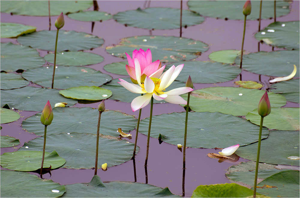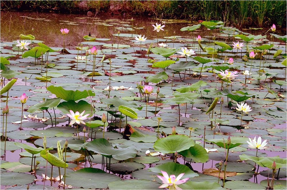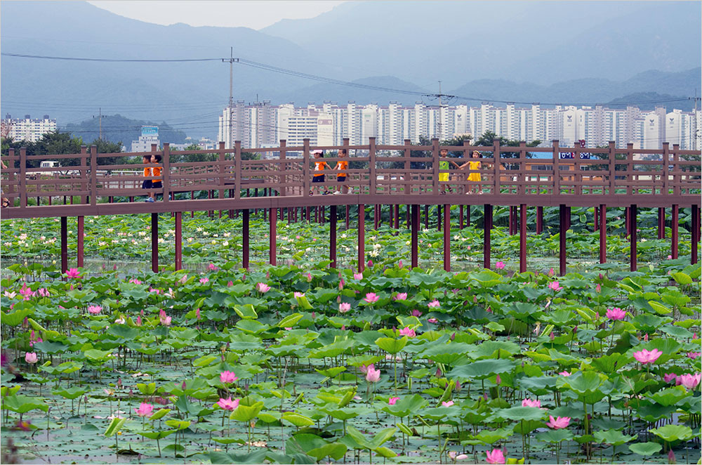 세 번째 방문은 오전 10시께였다. 예상하였듯 이번에는 아이들 말로 ‘대박!’이었다. 데크 다리 오른편 수면에 흐드러지게 피어난 흰빛과 분홍빛 꽃송이의 행렬이 화려했다. 정자에서 쉬고 있던 촌로가 올해 들어 꽃이 가장 많이 핀 듯하다고 했을 정도였다.